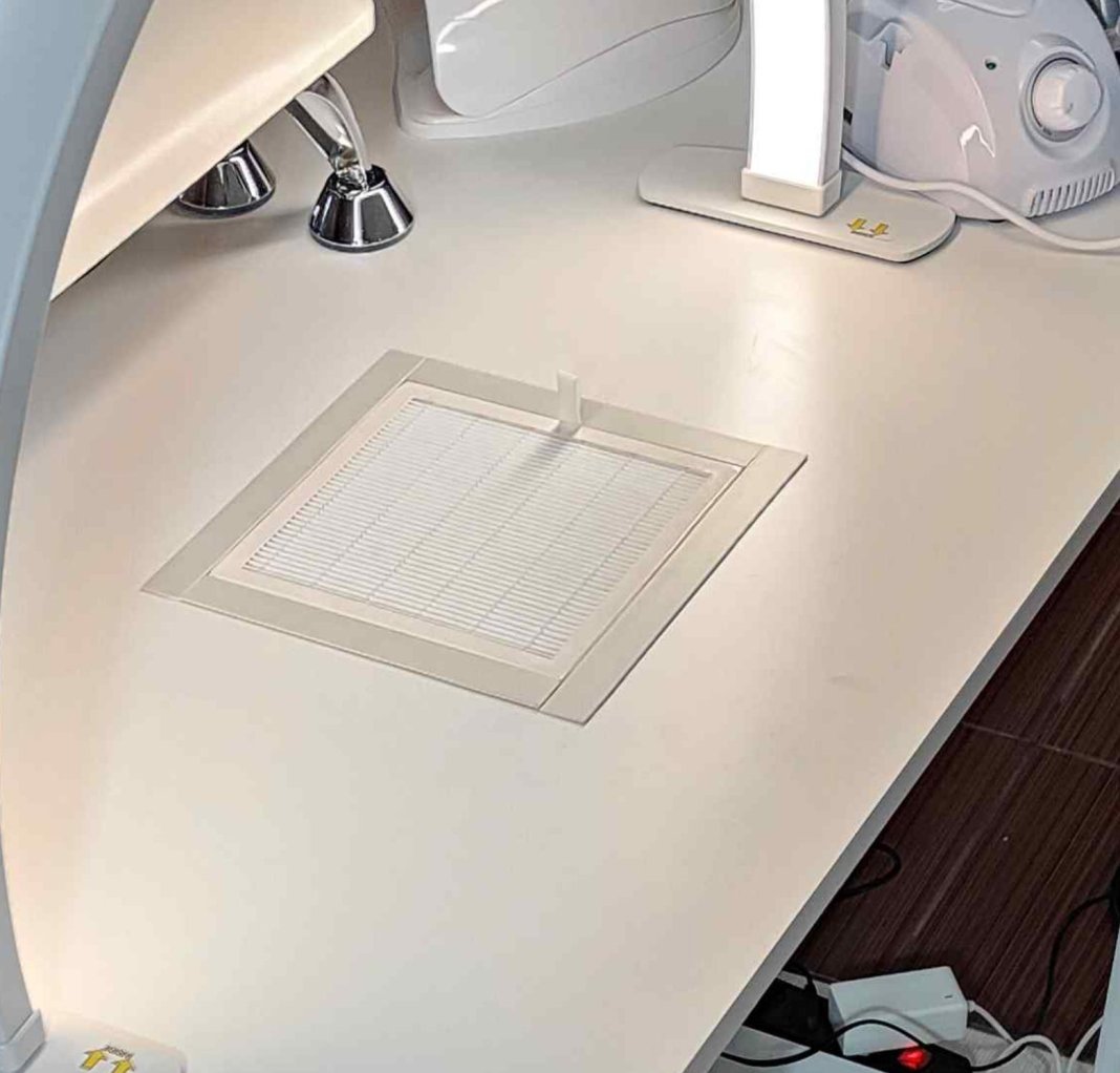- Colectorul Încorporabil: Se montează direct sub masa de manichiură, lăsând la vedere doar grila de aspirație. Acest design oferă un spațiu de lucru curat, o stabilitate superioară și un nivel de zgomot perceput mai mic, fiind preferat de saloanele premium.